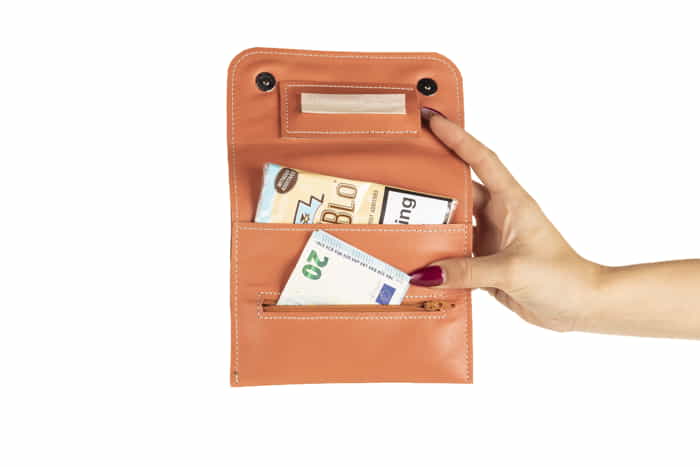 Tabaquera hecha a mano en piel suave de becerro para guardar el tabaco de liar junto con los accesorios en sus distintos departamentos pensados para tal función. Los botones son magnéticos de alta resistencia. El interior donde va alojado el tabaco está forrado con una doble piel de porcino. Ideal para llevar donde quieras protegiendo el contenido de forma elegante y muy práctica. Diseño por experiencia y sinceramente ha cumplido todas las expectativas. Las hacemos con la mejor piel para durar muchísimos años. Nos recordaras por mucho tiempo.